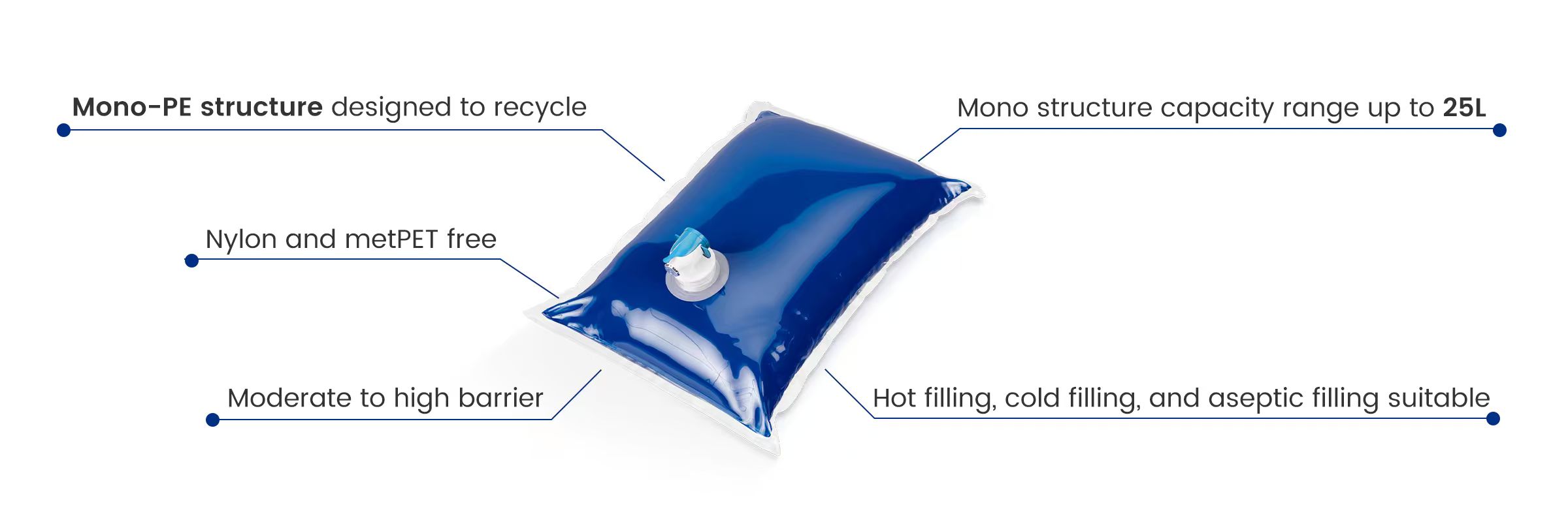 Nous perfectionnons nos emballages bag-in-box autour de structures monomatériaux, en privilégiant la simplification de la composition tout en préservant les performances requises pour les applications d'emballage de liquides. En minimisant la complexité des matériaux, cette approche mono-structure favorise la recyclabilité et rend l'emballage plus compatible avec les filières de recyclage existantes, en fonction des infrastructures locales. Parallèlement, cette simplicité structurelle est conçue pour préserver des propriétés essentielles telles que la résistance, l'efficacité de la barrière et la fiabilité de la distribution, garantissant ainsi que les impératifs de développement durable ne se fassent pas au détriment des performances fonctionnelles. Plutôt que d'ajouter des couches pour résoudre des problèmes isolés, nous concevons le bag-in-box comme un système éco-efficient, où structure, performance et fin de vie sont développées conjointement. Les marques peuvent ainsi adopter sereinement des emballages plus circulaires, tout en assurant la cohérence de la production, de la distribution et de l'utilisation.
